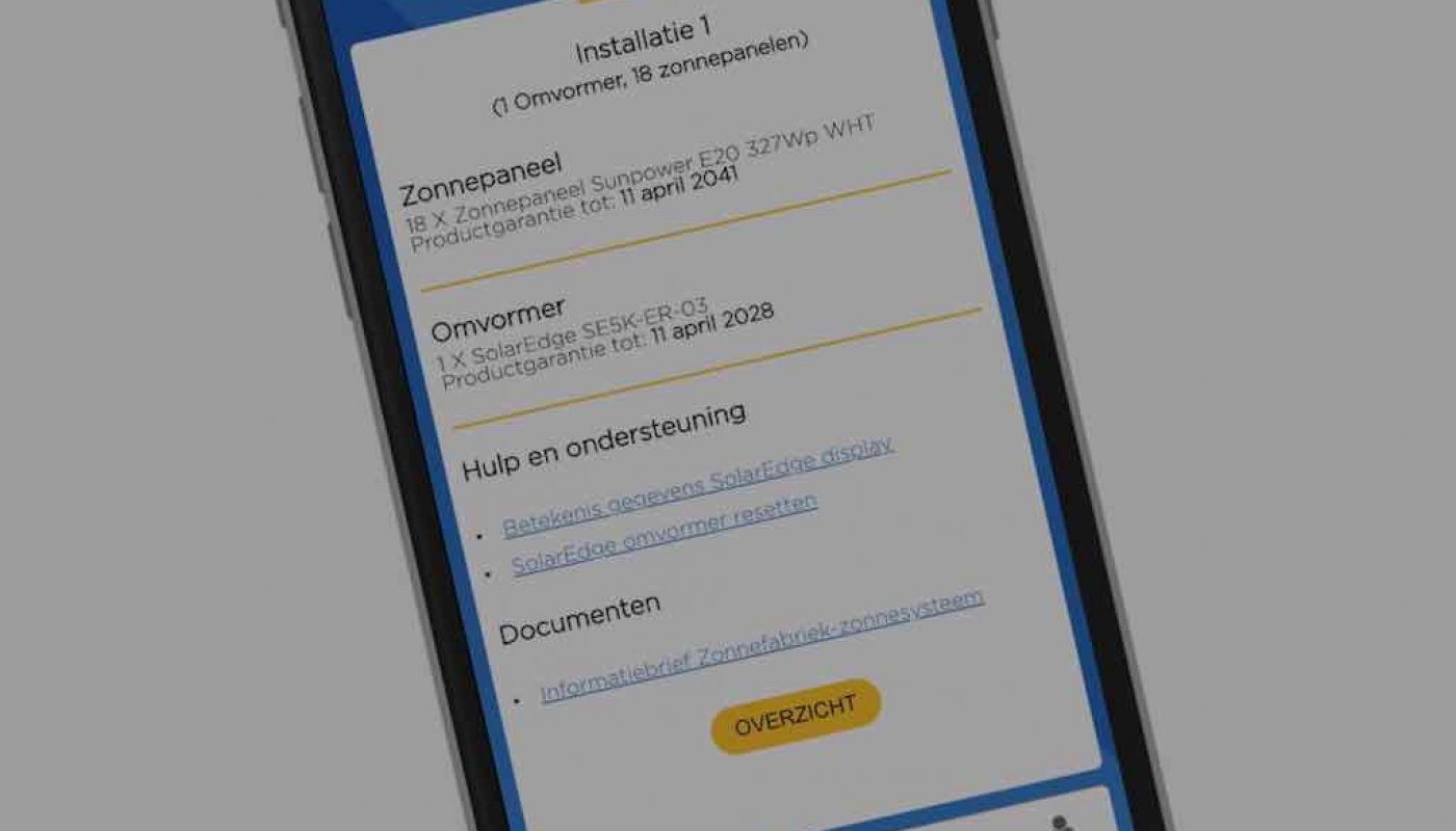In de Mijn Zonnefabriek app vindt u, naast de opbrengst, ook informatie over uw systeem (wat voor omvormer, wat voor panelen), de garantie (tot wanneer heeft u garantie op de producten), en tips (bijvoorbeeld: wat betekenen de lichtjes op de omvormer, hoe verander ik het wifi wachtwoord in de omvormer, enz.). Verder kunt u via de app ook nieuwe klanten aandragen, en daarmee €75 verdienen wanneer die klanten tot aanschaf van een systeem overgaan.