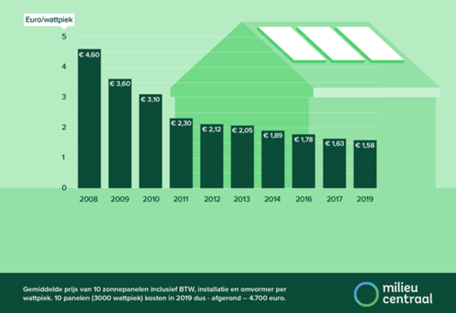 De terugverdientijd van een zonnepaneel is enorm verlaagd. Waar je een aantal jaar geleden nog panelen kocht met een terugverdientijd van meer dan 10 jaar, zijn ze nu al in 5 tot 8 jaar terug te verdienen. In tijden van economische onzekerheid is het rendement op de investering in zonnepanelen zeer aantrekkelijk. Meer informatie over de terugverdientijd vindt u hier.