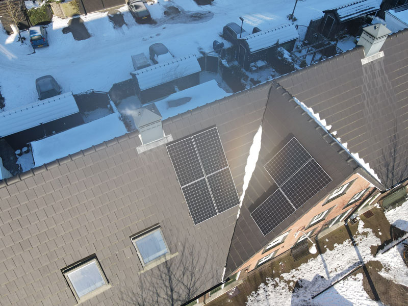 Wat een plaatje! Vanwege de verschillende hoeken waarin de zonnepanelen liggen, moet het een uitdaging geweest zijn de volledige installatie in beeld te krijgen. Met een drone is er een perfecte hoek gekozen, waardoor dit toch is gelukt. Ook is de foto genomen op een mooie dag: sneeuw én een zonnetje erbij. Deze foto laat zien dat zonnepanelen in de winter ook gewoon hun werk kunnen doen.