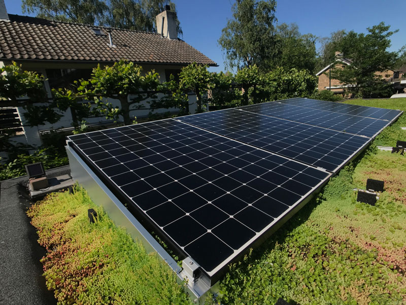 Groene daken, we komen ze niet vaak tegen. En dat terwijl een sedumdak, zeker in combinatie met zonnepanelen, hartstikke duurzaam is. En het levert mooie plaatjes op. Het blauw van de zonnepanelen staat in scherp contrast met het groen van het sedum en de bomen eromheen. Deze foto laat zien dat Zonnefabriek op alle type daken naar de beste oplossing zoekt.