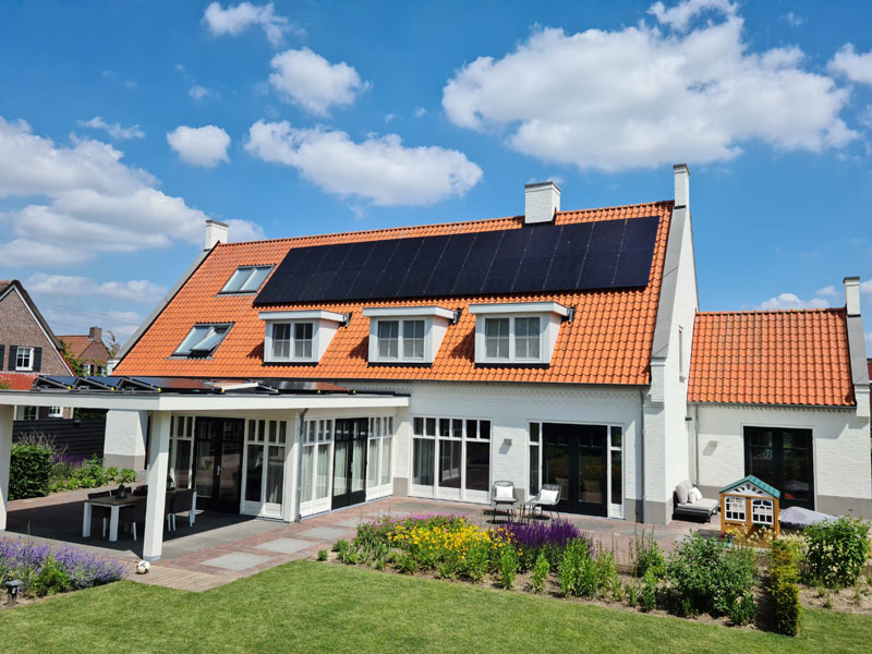 Bijzonder aan deze foto is dat het zowel een schuin dak als een plat dak systeem laat zien. De combinatie van kleuren springt er echt uit op deze foto. Het groene gras, de blauwe lucht, de rode dakpannen en het zwart van de full black panelen maken van deze foto een waar kunstwerk. Deze foto is het bewijs dat zonnepanelen niks afdoen aan de esthetiek van een huis.
