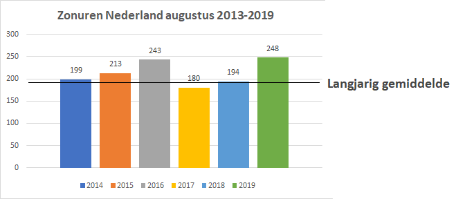 We moeten terug naar 2016 voor een vergelijkbaar aantal zon-uren: in augustus 2019 lag dat aantal volgens het KNMI op 248 gemiddeld over Nederland, terwijl het langjarig gemiddelde slechts 195 bedraagt.