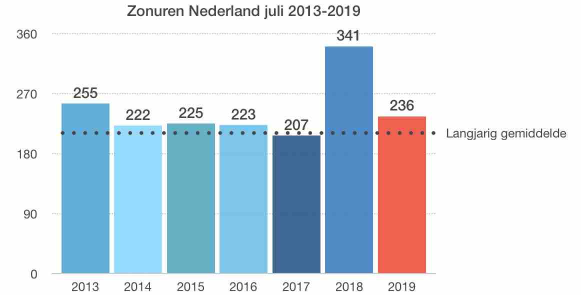 Maar buiten die hittegolf was er ook weer sprake van zon, volgens het KNMI gemiddeld over Nederland 236 uur en dat is ietsje meer dan de meeste voorgaande jaren, met uitzondering van vorig jaar. Want juli 2018 was met maar liefst 341 uur zon de zonnigste maand ooit; dat zullen we niet snel overdoen. Het langjarig gemiddelde voor de maand juli is overigens 211 uren zon.